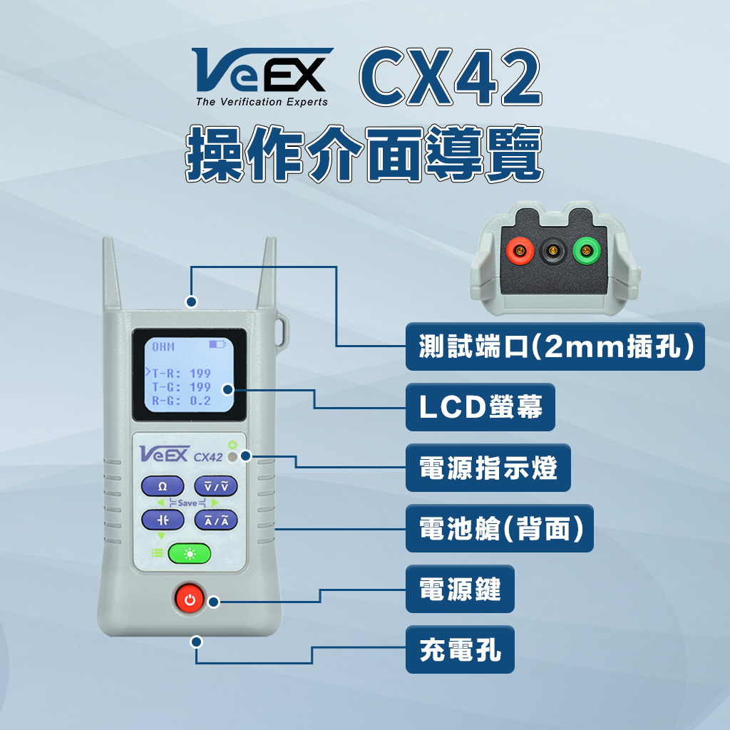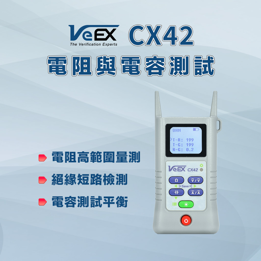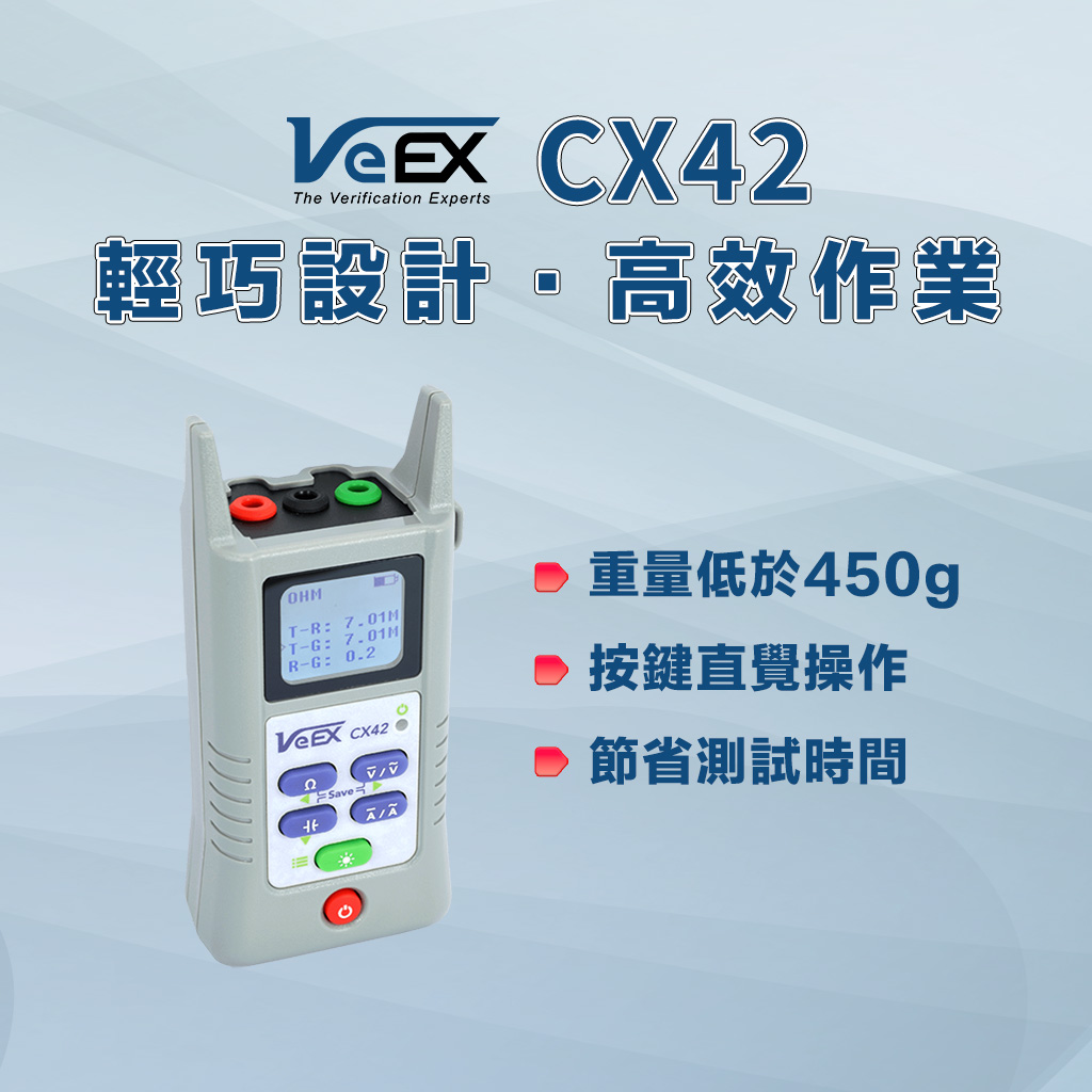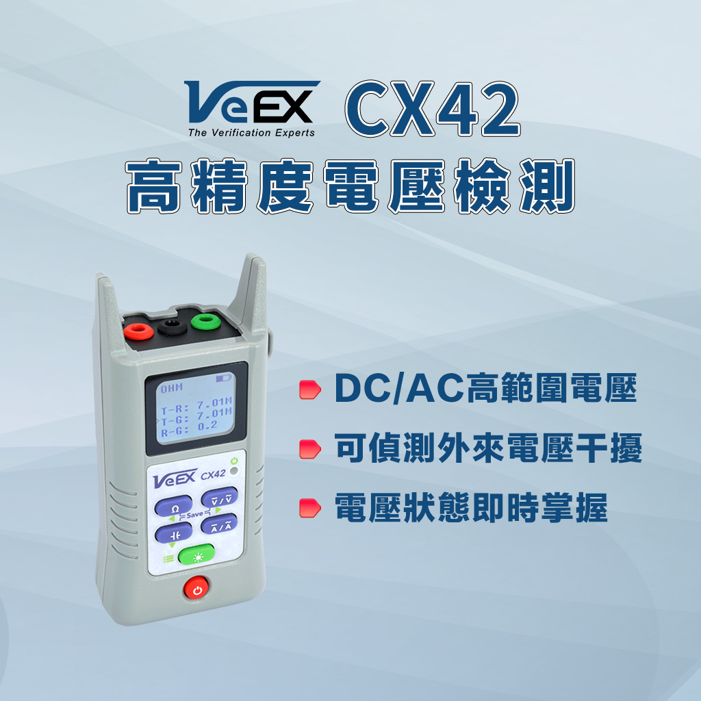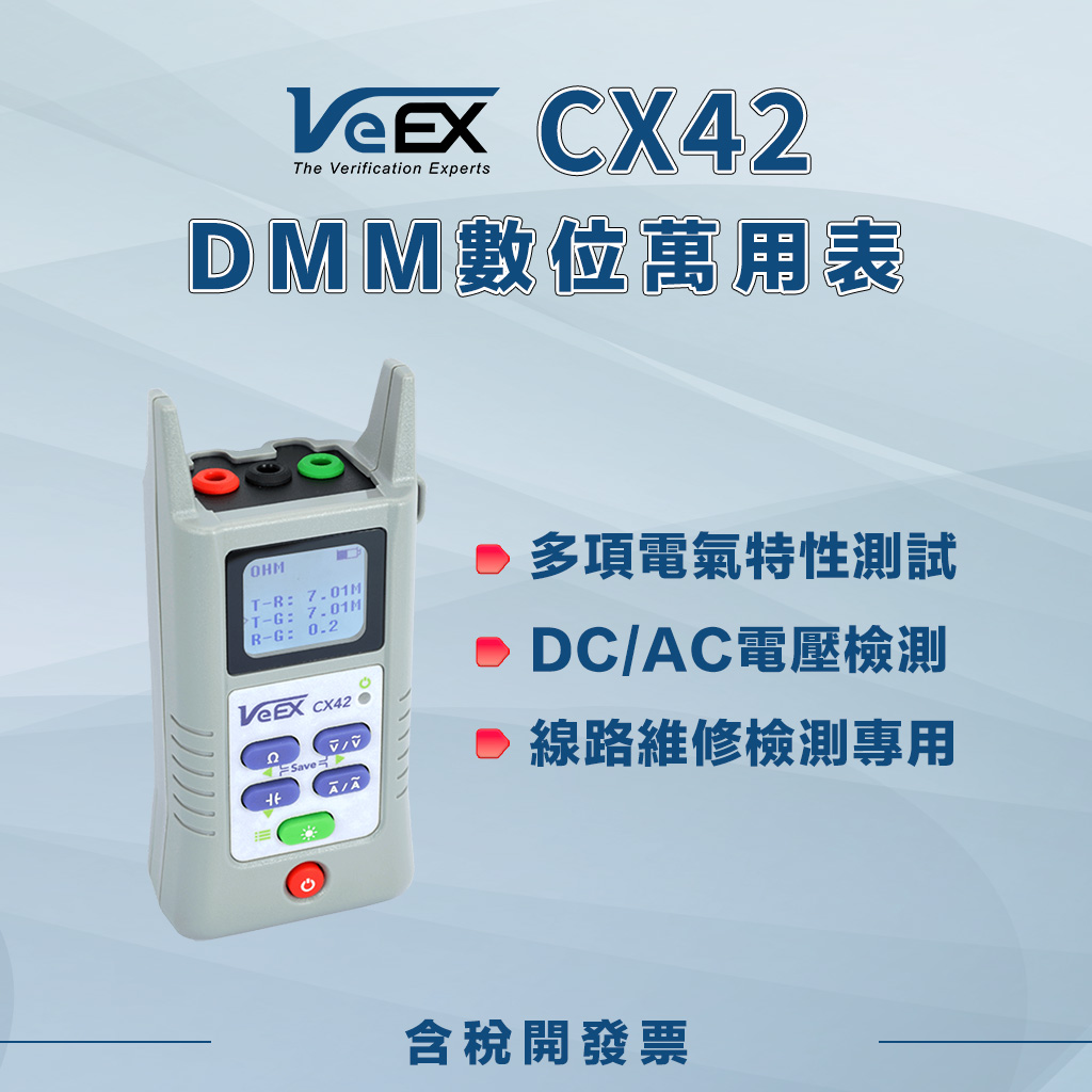 VeEX CX42 是一款輕巧、好攜帶的數位萬用表,堅固耐用的設計適用於戶外佈線 (OSP)、有線電視及寬頻網路的現場安裝與故障排除。